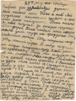 Но мой прадедушка продолжал учиться в школе. Он говорил, что ему очень нравилась география. Он любил рисовать разные карты. Будучи маленьким мальчиком, мой прадед писал своему отцу письма о жизни дома во время войны. Одно из них у нас хранится. Также мы дорожим письмом на фронт, которое мой прадед писал своему отцу.