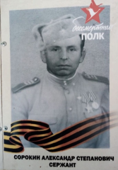 Мой дедушка, Сорокин Александр Степанович, в 1941 году был направлен на курсы наводчиков противотанкового орудия. С 1942 года принимал участие в боевых действиях против немецко-фашистских захватчиков. Он стал командиром противотанковой 76-мм пушки ЗИС-3. Закончил войну в Кёнигсберге (Калининград). Награждён орденом Славы 3-й степени, медалью за взятие Кёнигсберга, медалью за победу над Германией и орденом Отечественной войны 2-й степени.