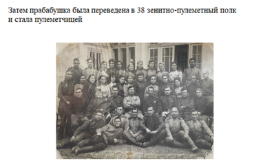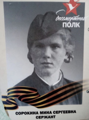 Моя бабушка, Сорокина Мина Сергеевна, первоначально была призвана на трудовой фронт. Рыла окопы и противотанковые рвы под Ленинградом. В конце 1941 года она пошла добровольцем в действующую армию в первый корпус противовоздушной обороны, который защищал небо Москвы. Мина Сергеевна поднимала аэростаты-заграждения, оборонявшие небо столицы. Там она прослужила до самой победы. Бабушка награждена медалью за оборону Москвы, медалью за оборону Москвы, медалью за победу над Германией и орденом войны 2-й степени.