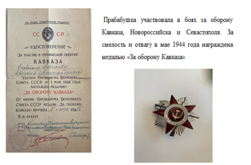 За самоотверженный труд в тылу Вера Сергеевна была награждена медалью «За доблестный труд в Великой Отечественной войне 1941–1945 гг.».